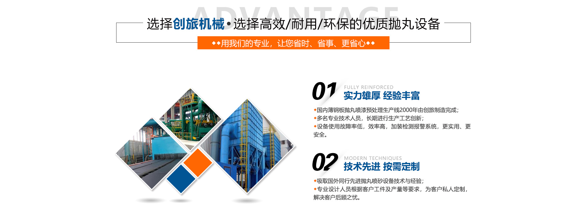 合肥市創(chuàng)旅機械有限公司是專業(yè)的噴砂房、拋丸機生產廠家,生產不同型號不同價格的江蘇拋丸機、江蘇 噴砂房、除銹機、拋丸清理機械、自動噴砂機械、通風除塵設備、砂處理成套設備、鋼丸及各種耐磨合金 件的大型專業(yè)化制造企業(yè)。 我公司愿與各行各業(yè)的朋友交往與合作,使您的產品更光彩! 產品有:鋼板預處理生產線,噴砂房,噴砂機械,噴砂設備,拋丸機,拋丸清理機,混砂機,噴丸機 ,拋 噴丸機,履帶式拋丸清理機,鋼板除銹機,鋼材除銹機,板...